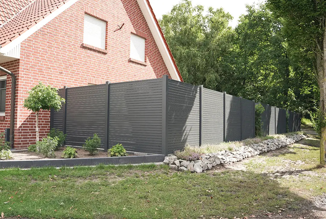 In edlem Anthrazit (RAL 7016) überzeugt dieser Rhombuszaun durch seine elegante Zurückhaltung. Die matte, strukturierte Oberfläche harmoniert mit verschiedensten Baustilen und fügt sich unaufdringlich ins Gesamtbild ein. Durch die um 30° geneigten Lamellen ist der Zaun von einer Seite blickdicht und bietet zuverlässigen Sichtschutz bei hoher Stabilität.