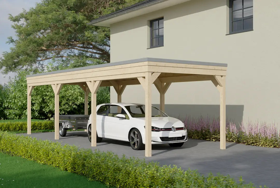 Wähle den Flachdachcarport aus BSH Fichte für eine offene und elegante Lösung, die Haltbarkeit und Funktionalität in den Vordergrund stellt. Dieser Carport ist die ideale Wahl für alle, die ihr Fahrzeug stilvoll und sicher unterstellen möchten, ohne die Notwendigkeit von Seitenwänden, was eine offene und zugängliche Atmosphäre schafft. Wir unterstützen dich gerne bei der Planung und Fertigung deines Carports nach Maß.