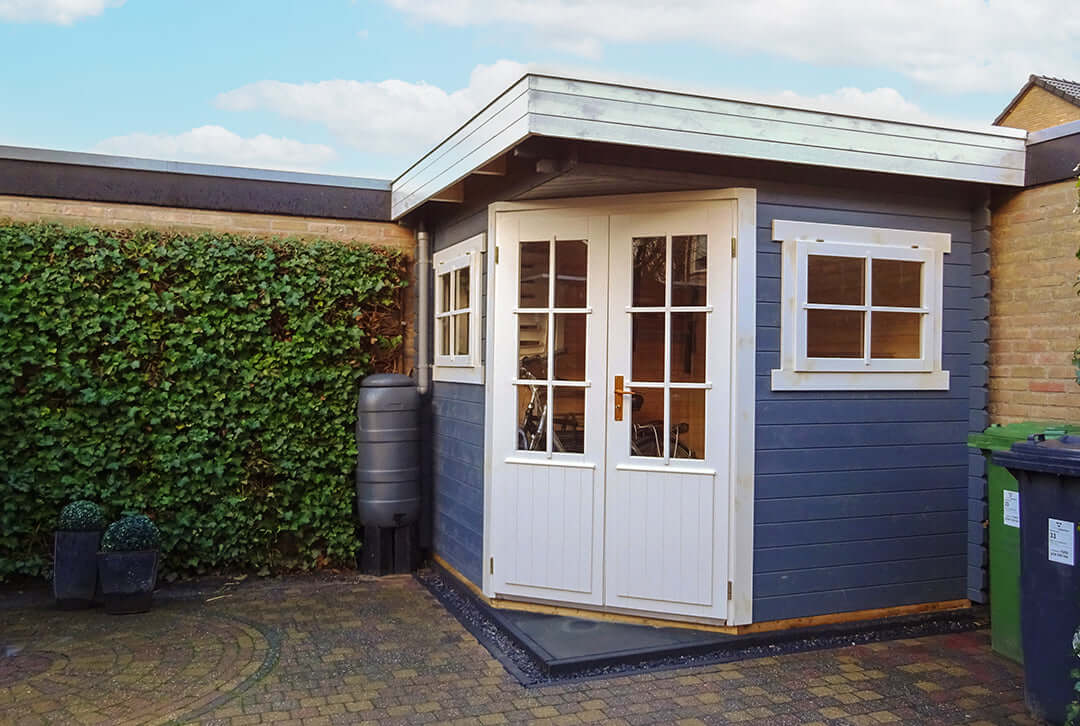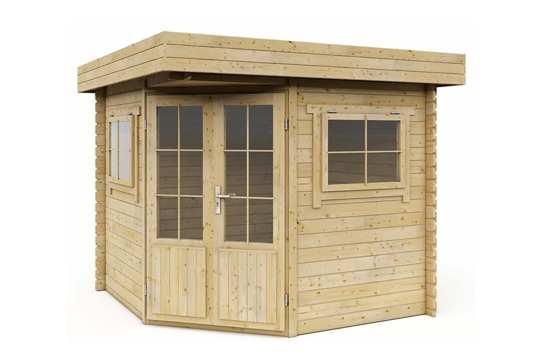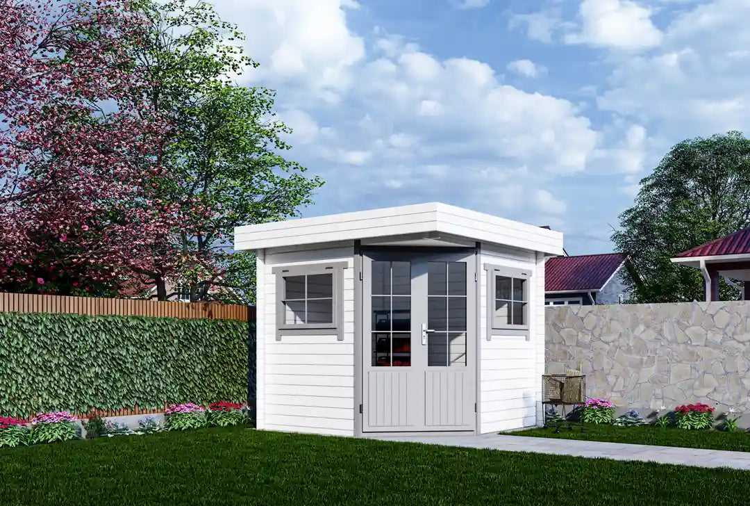 Modernes Gartenhaus mit „Flachdach“ aus hochwertigem nordischen Fichtenholz.