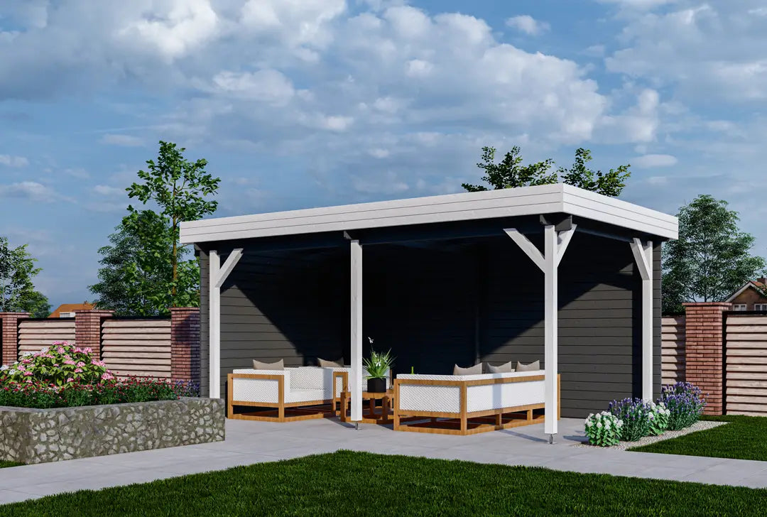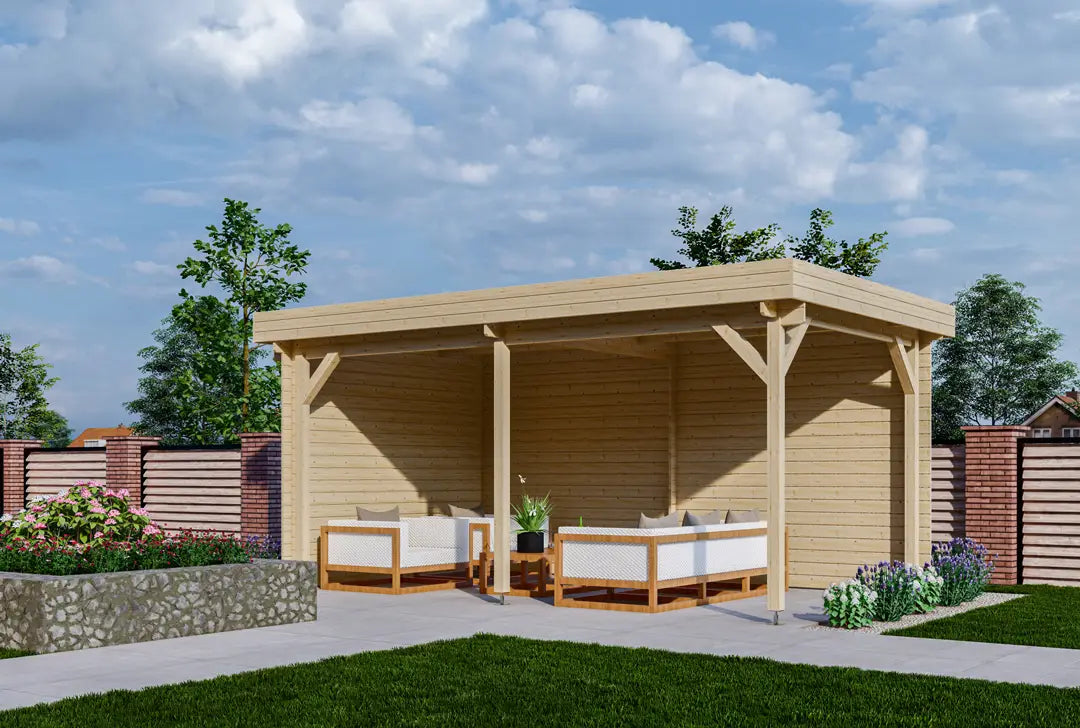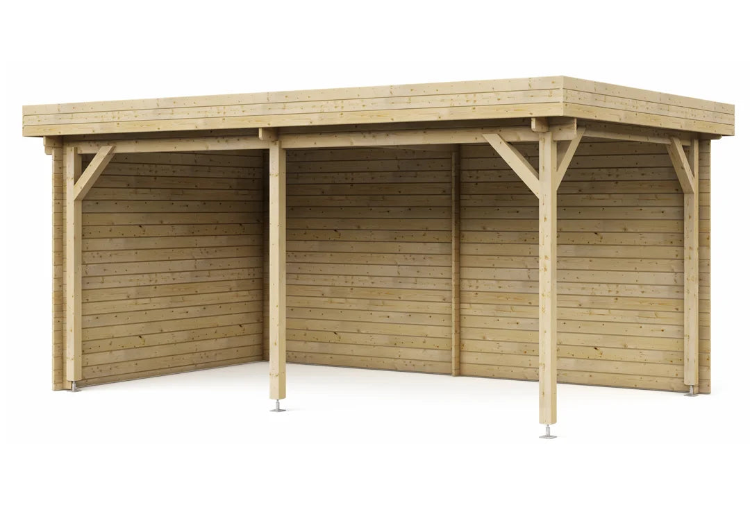 Modernes Gartenhaus mit „Flachdach“ aus hochwertigem nordischen Fichtenholz.