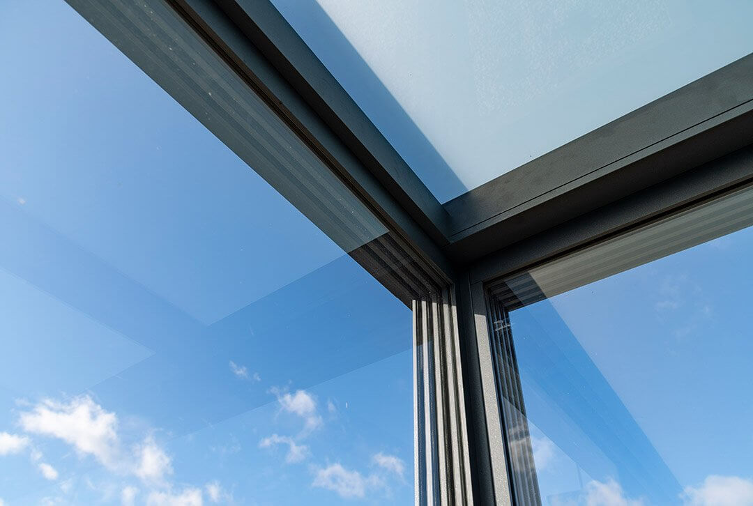 Du kannst eine Flatroof-Überdachung jederzeit mit Glasschiebewänden nachrüsten. Anders als bei standardmäßigen Terrassendächern werden hierbei keine Keilfenster benötigt.