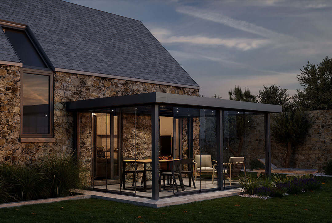 Du kannst eine Flatroof-Überdachung jederzeit mit Glasschiebewänden nachrüsten. Anders als bei standardmäßigen Terrassendächern werden hierbei keine Keilfenster benötigt.