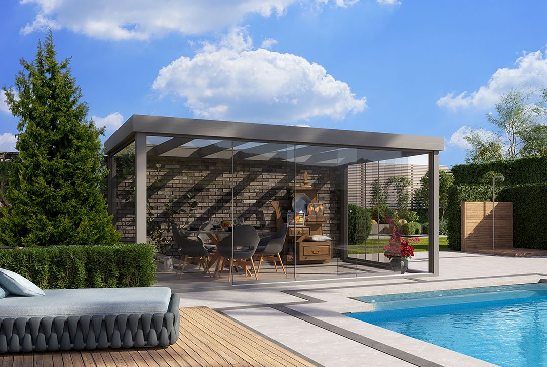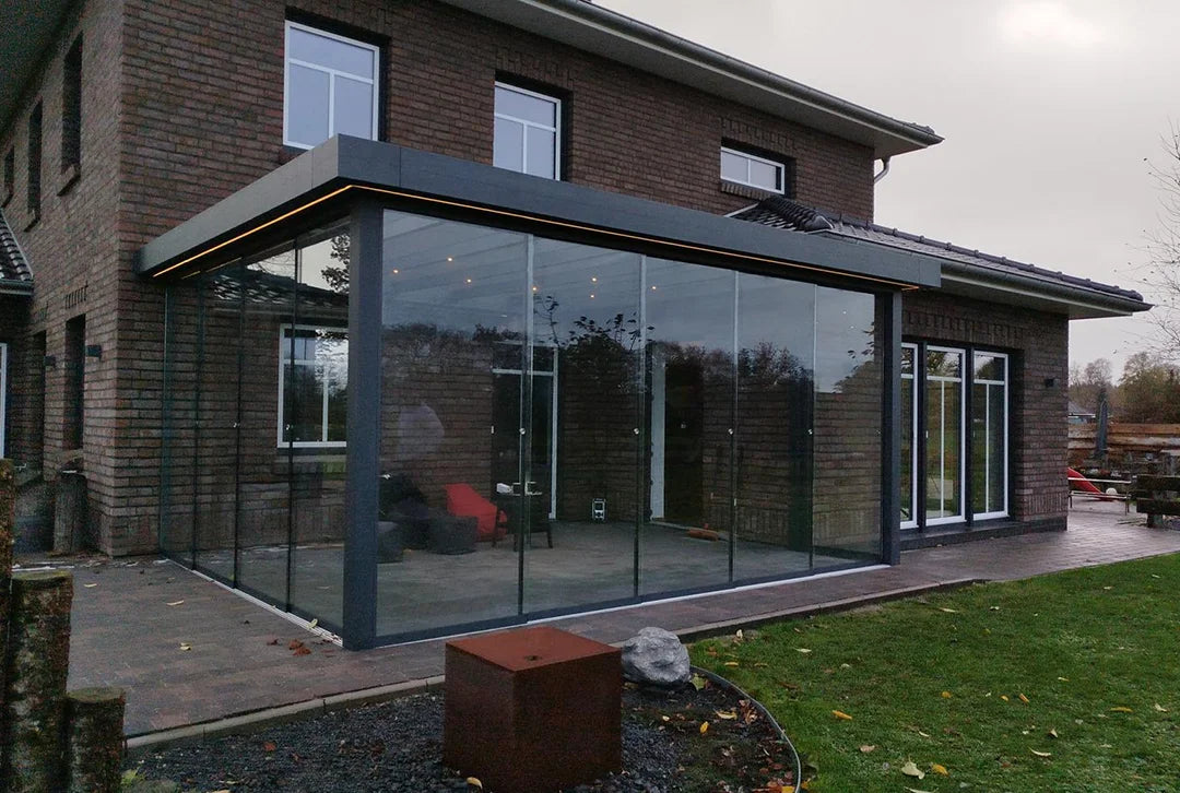 Du kannst eine Flatroof-Überdachung jederzeit mit Glasschiebewänden nachrüsten. Anders als bei standardmäßigen Terrassendächern werden hierbei keine Keilfenster benötigt.
