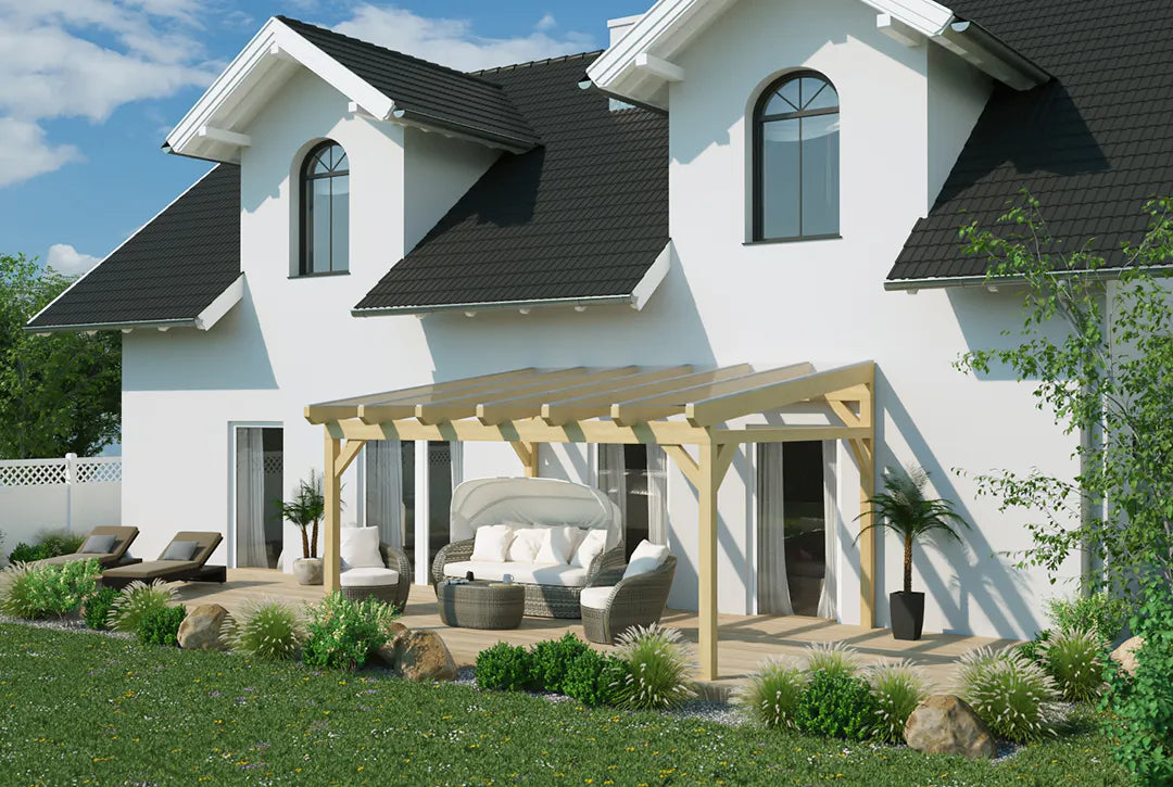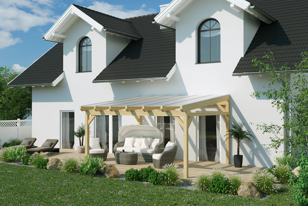 Bei dieser Terrassenüberdachung handelt es sich um die Abbund Variante, das heißt einfaches zusammenbauen der Terrassenüberdachung durch fix und fertig abgebundene Teile und du erhältst eine 3D-Zeichnung mit passendem Fundamentplan. Abbund Variante, das heißt du erhältst eine 3D-Zeichnung mit passendem Fundamentplan.