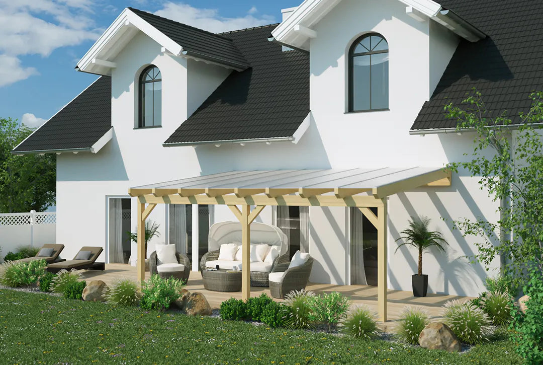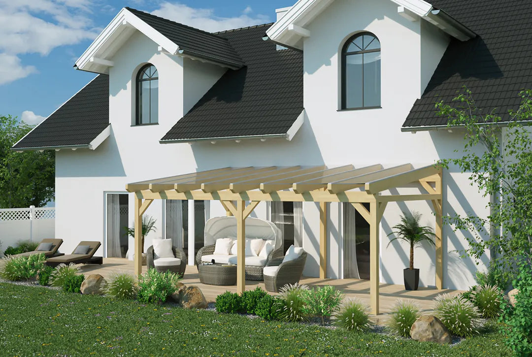 Hergestellt aus robustem Holz, das für seine Langlebigkeit bekannt ist, und in einem stilvollen graphitgrau gehalten, ist diese Überdachung eine attraktive und praktische Lösung für deine Terrasse. Ob für gemütliche Abende im Freien oder als geschützter Bereich für Pflanzen und Möbel – diese Terrassenüberdachung erfüllt alle Anforderungen.